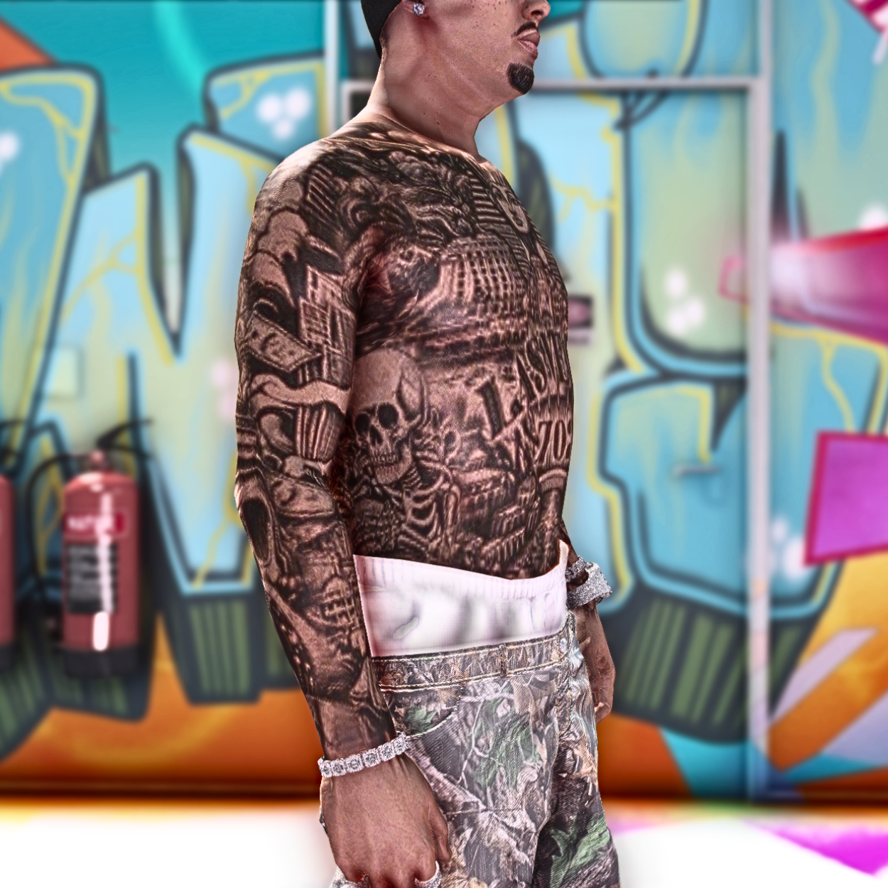 🎯 Full-Body Coverage – Ink across arms, chest, neck, and back